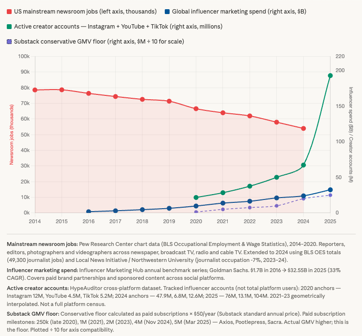 But look at the other lines. The global influencer marketing industry – money flowing to creators in exchange for their audiences’ attention – grew from $1.7 billion in 2016 to $32.6 billion in 2025. That is a 19-fold increase in under a decade, compounding at roughly 35% per year. The number of tracked active creator accounts across Instagram, YouTube and TikTok grew from around 22 million in 2020 to 193 million by 2025 (tracked creator/influencer accounts, not all of which are monetising or active). And Substack, where readers pay writers directly with no masthead in the middle, went from essentially zero to a conservative GMV floor of $250 million per year – and that is the floor, based on the standard $50/year subscription price. The actual average is higher.